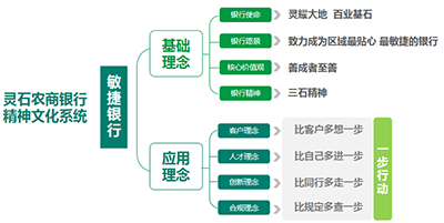 在新時(shí)代、新發(fā)展背景下,復(fù)大·復(fù)為 靈石農(nóng)商銀行項(xiàng)目組以新時(shí)代公民道德建設(shè)實(shí)施綱要為指導(dǎo),以現(xiàn)階段靈石農(nóng)商銀行發(fā)展構(gòu)想為引領(lǐng),構(gòu)建了以“敏捷銀行”為發(fā)展定位的銀行企業(yè)文化系統(tǒng)。提煉出以“靈耀大地 百業(yè)基石”為銀行使命:做日月光耀大地的銀行,服務(wù)“三農(nóng)”,將鄉(xiāng)村金融服務(wù)做深做透,為每一塊陽光照耀的土地奉獻(xiàn)自己的光和熱;做普惠百業(yè)發(fā)展的金融基石,以主動開放的生態(tài),不斷提升服務(wù)能力,以高質(zhì)量、高效益的運(yùn)營水平,服務(wù)區(qū)域經(jīng)濟(jì)多元發(fā)展。