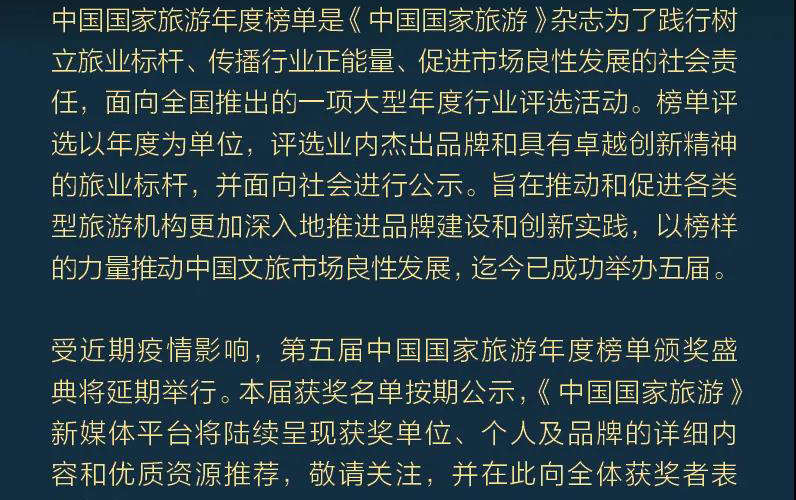 據(jù)悉,中國(guó)國(guó)家旅游年度榜單是《中國(guó)國(guó)家旅游》雜志著眼踐行樹(shù)立旅業(yè)標(biāo)桿、傳播行業(yè)正能量、促進(jìn)市場(chǎng)良性發(fā)展的社會(huì)責(zé)任,面向全國(guó)推出的一項(xiàng)大型年度行業(yè)評(píng)選活動(dòng)。榜單評(píng)選以年度為單位,評(píng)選業(yè)內(nèi)杰出品牌和具有卓越創(chuàng)新精神的旅業(yè)標(biāo)桿,并面向社會(huì)進(jìn)行公示,旨在推動(dòng)和促進(jìn)各類型旅游機(jī)構(gòu)更加深入地推進(jìn)品牌建設(shè)和創(chuàng)新實(shí)踐,以榜樣的力量推動(dòng)中國(guó)文旅市場(chǎng)良性發(fā)展。