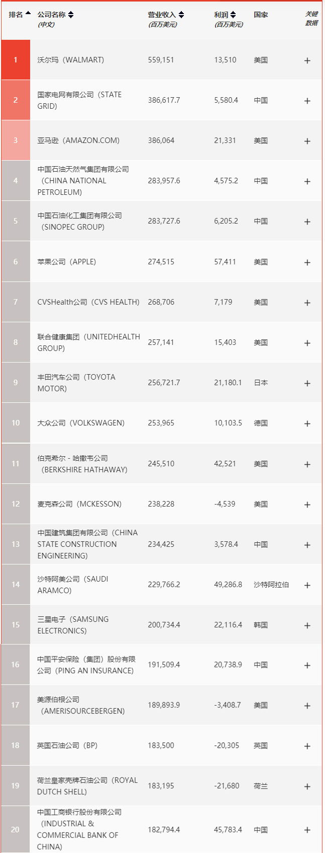 世界500強榜單前20排位