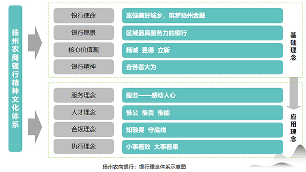 基于此,復為項目組通過專業(yè)工具分析,結合銀行經(jīng)營實際,打造了揚州農(nóng)商銀行文化理念體系。