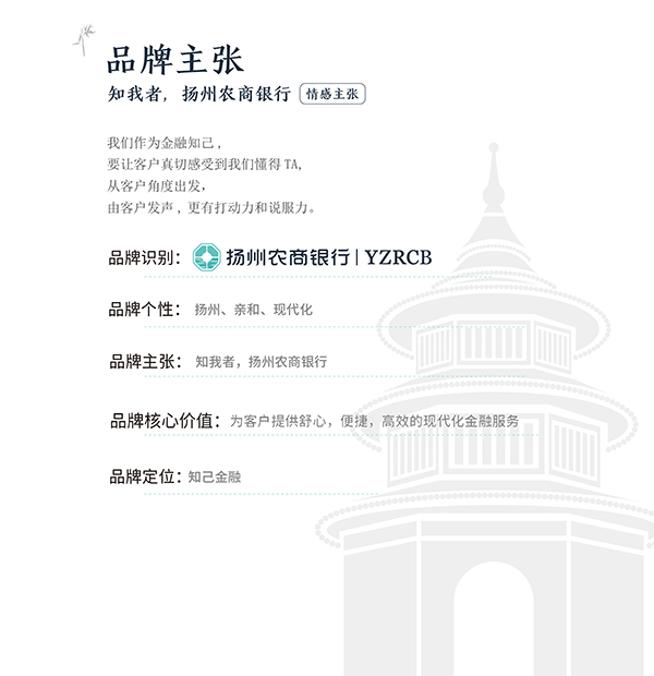 銀行視覺形象作為銀行文化的一部分,是企業(yè)的一種無形資產(chǎn)。復為項目組從區(qū)域人文、歷史文化中汲取文化因子,打造鮮明的、差異化的、融入揚州地域文化特色和本地銀行特色的銀行形象,提升揚州人民對揚州農(nóng)商銀行的認同感,從而迅速建立客戶感知,降低宣傳推廣的成本,成為銀行未來發(fā)展的重要內驅力。