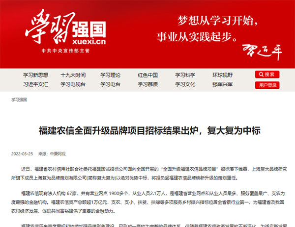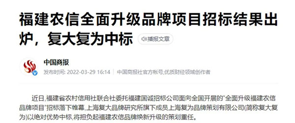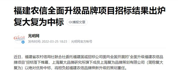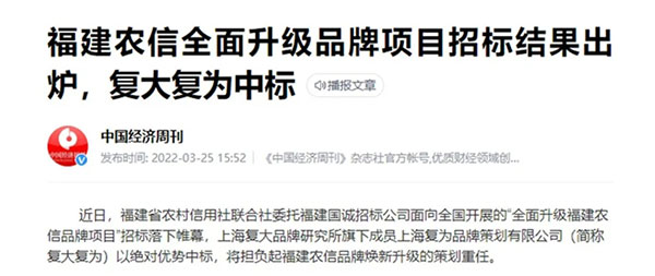 近日,學(xué)習(xí)強國、光明網(wǎng)、中國經(jīng)濟周刊、金融界等權(quán)威媒體集中報道了福建農(nóng)信全面升級品牌項目招標(biāo)結(jié)果,介紹了“全面升級福建農(nóng)信品牌項目”的重要意義,對擔(dān)任策劃重任的復(fù)大復(fù)為給予了極大關(guān)注。