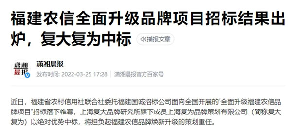 近日,福建省農(nóng)村信用社聯(lián)合社委托福建國誠招標(biāo)公司面向全國開展的“全面升級福建農(nóng)信品牌項目”招標(biāo)落下帷幕,上海復(fù)大品牌研究所旗下成員上海復(fù)為品牌策劃有限公司(簡稱復(fù)大復(fù)為)中標(biāo),將擔(dān)負起福建農(nóng)信品牌煥新升級的策劃重任。