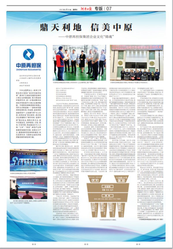 5月26日,《河南日?qǐng)?bào)》刊發(fā)了“鼎天利地 信美中原——中原再擔(dān)保集團(tuán)企業(yè)文化‘鑄魂’”的專題報(bào)道,深入闡述中原再擔(dān)保集團(tuán)企業(yè)文化的建設(shè)成果及重要意義,高度肯定了以“鼎信之道”為主題的中原再擔(dān)保集團(tuán)企業(yè)文化建設(shè)。
