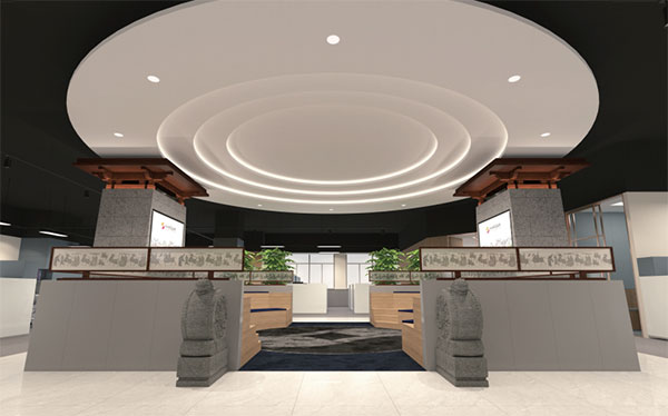 復(fù)大復(fù)為項目組為徐州農(nóng)商銀行以“漢文化”為主題進行了空間打造,在設(shè)計理念上充分吸收了兩漢文化中“天圓地方”的思想,在視覺呈現(xiàn)上隨處可見的車馬圖、古城墻造型等,仿佛歷史照進現(xiàn)實,讓客戶精神上震撼、情感上親近。