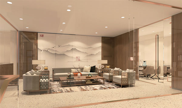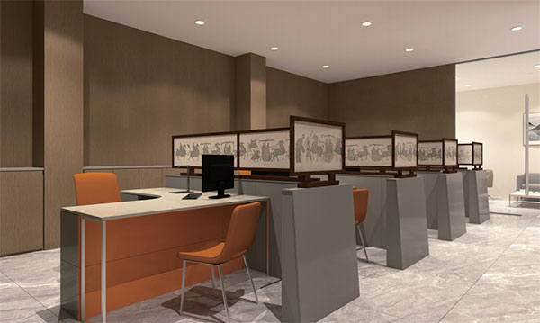 如揚州農(nóng)商銀行網(wǎng)點的打造,復(fù)大復(fù)為項目組從揚州園林文化中提取了大量的、常見的特色元素,并將其融入視覺設(shè)計中,讓網(wǎng)點空間內(nèi)處處透露著江南水鄉(xiāng)的文化精華和人文風(fēng)韻,一進門就能帶給客戶家一般的熟悉感和親近感,留住了客戶的腳步也留住了客戶的心。