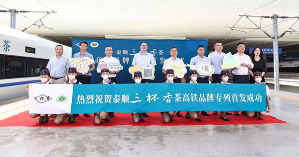 8月3日上午,以“三杯香﹒共富茶﹒幸福茶”為主題的2022泰順三杯香品牌高鐵動車首發(fā)式在上海虹橋站舉行。當(dāng)天,滿載著三杯香品牌標(biāo)識的G7311次泰順“三杯香”品牌冠名列車首發(fā),并從虹橋站緩緩駛出,讓各地游客在高鐵“慢時光”中細(xì)品“三杯香”。
