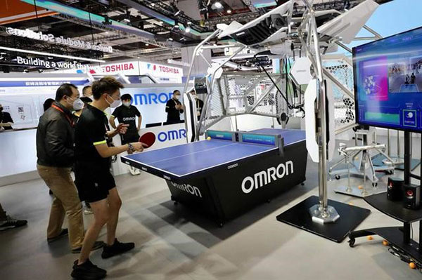 技術(shù)裝備展區(qū),參展商展示與歐姆龍第七代乒乓球教練機(jī)器人“過(guò)招”。