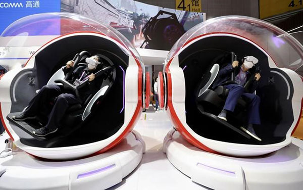 技術(shù)裝備展區(qū),觀眾在高通展臺(tái)感受VR技術(shù)。
