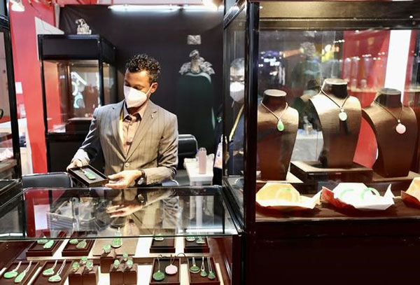 消費(fèi)品展區(qū)時(shí)尚服飾及配飾專(zhuān)區(qū),緬甸珠寶商展示翡翠展品。