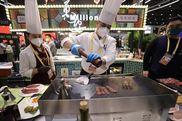食品及農(nóng)產(chǎn)品展區(qū),參展商現(xiàn)場(chǎng)制作美食。