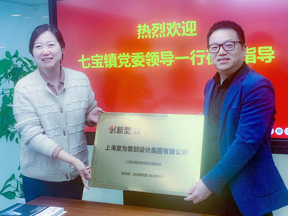 李蓉委員對復(fù)為策劃設(shè)計集團(tuán)在專業(yè)服務(wù)、推動行業(yè)進(jìn)步、助力上海創(chuàng)意經(jīng)濟(jì)發(fā)展等方面做出的成績給予了高度評價!并向集團(tuán)轉(zhuǎn)授“上海市重點企業(yè)”服務(wù)包和“上海市創(chuàng)新型企業(yè)”牌匾。陳云勇博士接過殊榮,感謝七寶鎮(zhèn)和各級政府領(lǐng)導(dǎo)對復(fù)為集團(tuán)的鼓勵和賦能,且表示復(fù)為集團(tuán)將以殊榮為馬,策馬揚鞭,再接再厲、再創(chuàng)新高。