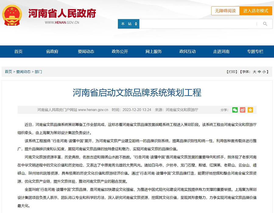 近日,河南省文旅品牌系統(tǒng)策劃籌備工作全部完成,這標志著河南省文旅品牌發(fā)展戰(zhàn)略系統(tǒng)工程進入策劃階段。該系統(tǒng)工程由河南省文化和旅游廳組織牽頭,由上海復為策劃設計集團負責設計。