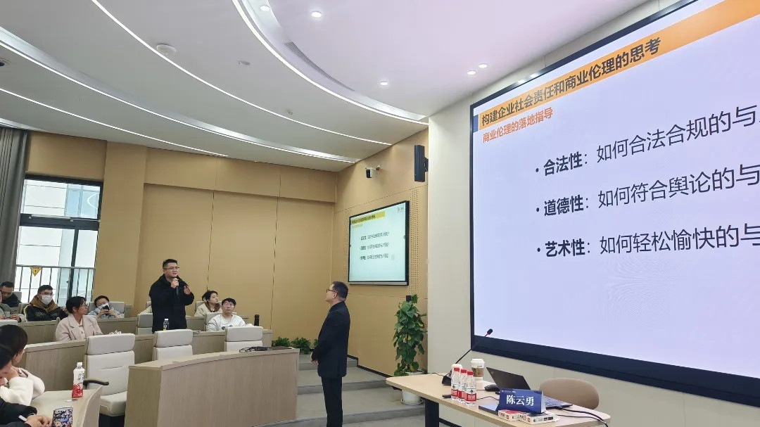 講座伊始,陳教授以“企業(yè)社會(huì)責(zé)任與商業(yè)倫理”為主題,從三方面展開論述:“如何理解兩者的內(nèi)涵”“企業(yè)為何需要踐行社會(huì)責(zé)任”“AI時(shí)代如何構(gòu)建新型商業(yè)倫理”。他以“誠信、公平、可持續(xù)發(fā)展”為關(guān)鍵詞,結(jié)合案例生動(dòng)闡釋了商業(yè)倫理的本質(zhì):“誠信是經(jīng)營價(jià)值的載體,公平是主觀激勵(lì)的平衡,可持續(xù)是復(fù)購與信任的根基?!彼麖?qiáng)調(diào),“君子愛財(cái)取之有道”是中國傳統(tǒng)智慧對(duì)商業(yè)倫理的精辟總結(jié),企業(yè)需在追求利益的同時(shí)恪守道義。