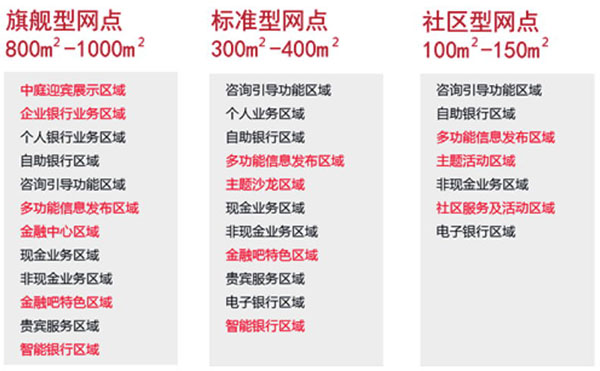 我們圍繞著體驗(yàn)展開(kāi),在不改變現(xiàn)有視覺(jué)基礎(chǔ)元素的前提下,從平面動(dòng)線出發(fā),結(jié)合客戶的需求,以面積和承載的功能為依據(jù),首先對(duì)營(yíng)業(yè)廳進(jìn)行了功能劃分,總體的平面設(shè)計(jì)定位分為:旗艦型網(wǎng)點(diǎn)800㎡-1000㎡、標(biāo)準(zhǔn)型網(wǎng)點(diǎn)300㎡-400㎡、社區(qū)型網(wǎng)點(diǎn)100㎡-150㎡三大類。