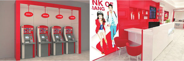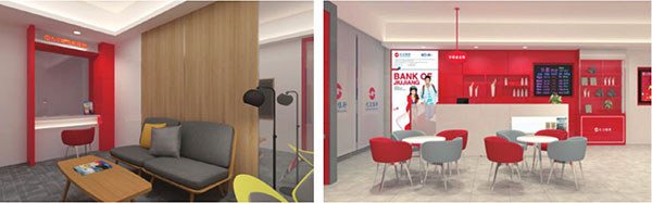 根據(jù)客戶要求及實(shí)際情況,首先,現(xiàn)有標(biāo)識(shí)、色彩、字體、外部門楣視覺(jué)形象保持不變,內(nèi)部空間作調(diào)整;其次,注重標(biāo)準(zhǔn)化與個(gè)性化之間的權(quán)衡,厘清省級(jí)、市級(jí)、縣級(jí)、社區(qū)等不同級(jí)別網(wǎng)點(diǎn)之間的層級(jí)關(guān)系;最后要顛覆傳統(tǒng)銀行的概念(現(xiàn)金柜臺(tái)、接待臺(tái)等),多往體驗(yàn)型、智能型等方向創(chuàng)新。