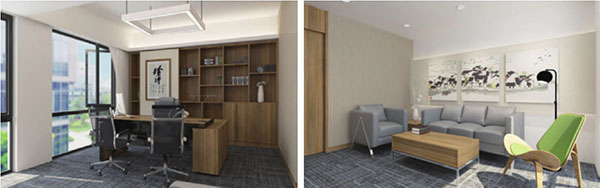 辦公室的設(shè)計(jì)選擇了三套材質(zhì)和色系不同的方案,以供挑選,三套色系通過(guò)材料的不同,營(yíng)造出不一樣的氛圍。沙發(fā)、茶幾與整個(gè)色系相統(tǒng)一,在沙發(fā)背景墻上,采用了木工板為基層,亞麻布外包表面的裝飾畫。在其余空白墻面則采用墻紙進(jìn)行裝飾,美觀、環(huán)保,壁紙的顏色可根據(jù)整個(gè)色調(diào)的不同進(jìn)行更改。地面則采用地毯或PVC地板,整個(gè)辦公室呈現(xiàn)出溫暖、舒適的感覺(jué)。