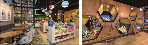在設(shè)計(jì)特色區(qū)域時(shí),可變、靈活是我們思考的方向。常規(guī)狀態(tài)下它以書(shū)吧形式呈現(xiàn);非常規(guī)狀態(tài)下,它又是一個(gè)員工會(huì)議室、課堂、放映室,甚至可以作為網(wǎng)點(diǎn)產(chǎn)品的發(fā)布會(huì)場(chǎng)所,定期發(fā)布新的金融產(chǎn)品;還可以作為金融知識(shí)講堂,既增加了客流量,又能將整個(gè)區(qū)域合理利用。在書(shū)架的設(shè)計(jì)上,通過(guò)一個(gè)可愛(ài)的巴士的形象,將整個(gè)區(qū)域形成一個(gè)形象的場(chǎng)景,在路牌上顯示指示標(biāo)識(shí)起到引導(dǎo)作用。家具采用折疊形式,在不需要的時(shí)候可以掛在墻上,更好地利用空間。講臺(tái)背后的墻面,是軟木板移門,可固定紙質(zhì)文件,移門后安放了電視機(jī),當(dāng)移門打開(kāi),可觀看影像。