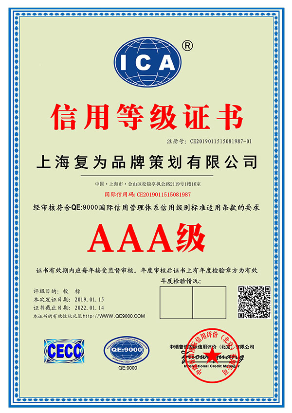 2019年1月20日,上海復(fù)為品牌策劃有限公司收到國(guó)家頒發(fā)的信用等級(jí)認(rèn)證證書(shū),被認(rèn)定為“信用AAA級(jí)”企業(yè)。