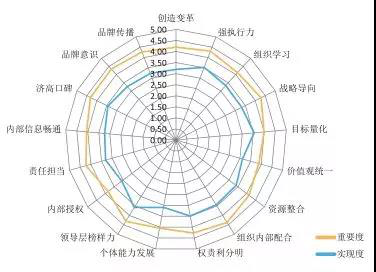 項(xiàng)目組以組織文化分析為基礎(chǔ),還結(jié)合“重要度與實(shí)現(xiàn)度”的差異分析,得出了文化的核心要素和側(cè)重方向;并針對每一個(gè)維度進(jìn)行具體分析和專項(xiàng)理解得出立體式的“濟(jì)高控股文化概況”,形成圖表和系統(tǒng)總結(jié)。