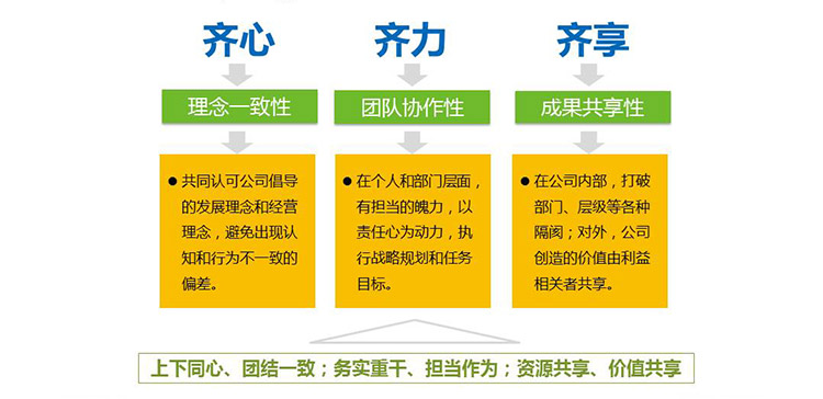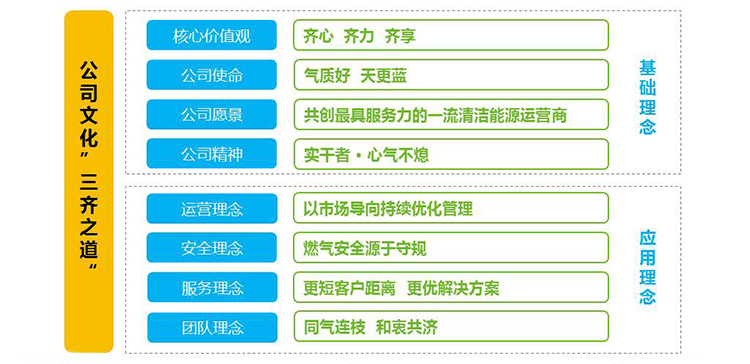 經(jīng)過前期定性定量調(diào)研、驗證分析,項目組以“齊心、齊力、齊享”核心價值觀為導(dǎo)向構(gòu)建了港華燃氣企業(yè)文化體系。通過理念一致性、團隊協(xié)作性、成果共享性三個層面,明確公司全員價值判斷標準,引導(dǎo)和規(guī)范員工行為。為便于對公司內(nèi)部員工文化宣貫、對外部形象宣傳,將該企業(yè)文化體系簡稱為“三齊之道”。